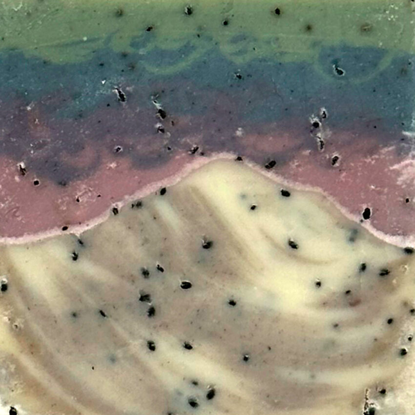 A rich blend of olive, coconut, sweet almond, and castor oils, paired with cocoa and shea butters, keeps skin soft and hydrated. Natutal colorants like alkanet root, rhubarb, indigo, and green clay help detox and brighten, while basil seeds provide mild exfoliation to smooth and renew without stripping.